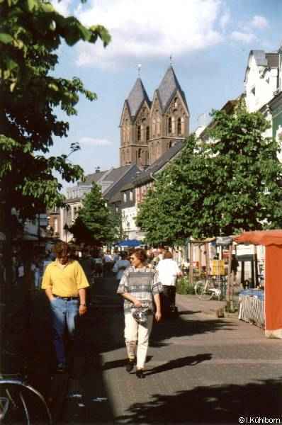 Die Bergische Landstraße ist teilweise Fußgängerzone, durch die bis 1922 noch eine Straßenbahn fuhr.