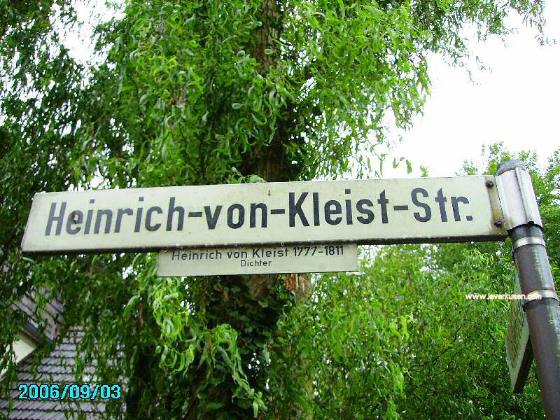 Heinrich-von-Kleist-Str. Zuerst erwähnt Die 1957 im Stadtplan verzeichnete Goethestr. wurde 1975 im Rahmen der kommunalen Neugliederung in Heinrich-von-Kleist-Str. umbenannt. Art der Straße Nicht klassifiziert Stadtteil Wiesdorf Postleitzahl 51373 Historische Bedeutung Bernd Heinrich Wilhelm von Kleist (* 18. Oktober, nach Kleists eigenen Angaben 10. Oktober 1777 in Frankfurt (Oder); † 21. November 1811 in Berlin-Wannsee durch Suizid) war ein preußischer Dramatiker, Erzähler, Lyriker und Publizist. Ansichten & Impressionen Bild vergrößern Bild vergrößern
