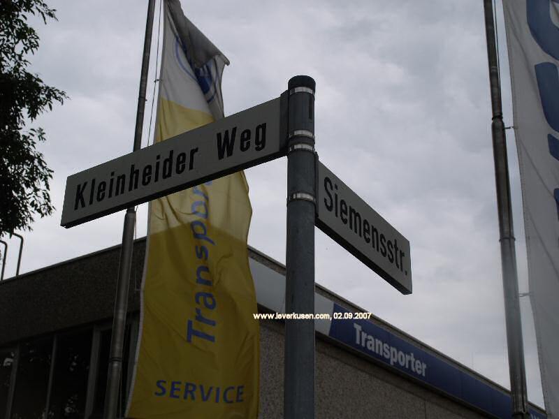 Der Quettinger Kleinheider Weg endet an beiden Enden in einer Sackgasse. Er ist Teil des Gewerbegebietes Fixheide, das er zum Bürgerbusch abschließt.