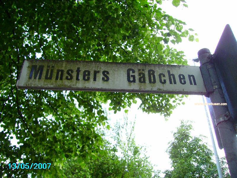 Münsters Gäßchen Zuerst erwähnt 1956 wurde der Weg Münzers Gäßchen genannt. Durch Namensverwechslung wurde er im gleichen Jahr in "Münsters Gäßchen" umbenannt. Art der Straße Nicht klassifiziert Stadtteil Schlebusch Postleitzahl 51375 Historische Bedeutung Familie Münzer hätte ein Grundstück am Eingang des Weges besessen. Deshalb im Volksmünd "Münzers Gäßchen". Ansichten & Impressionen Bild vergrößern Bild vergrößern Bild vergrößern Bild vergrößern