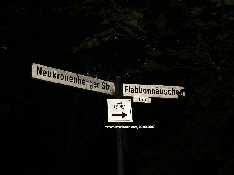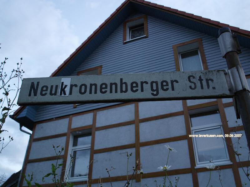 Zuerst erwähnt1931 wurde die Neukronenberger Straße auf Lützenkirchener Seite benannt, 1937 erfolgte die Benennung in Neukronenberger Weg auf Bergisch Neukirchener Seite.